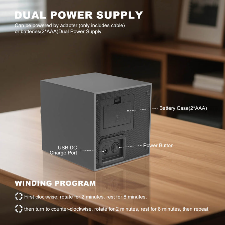 Dual Power Supply: Our single watch winder can be powered by USB charging or 2*AA batteries (Not included), you could charge it by power bank during the journey and is convenient to carry.